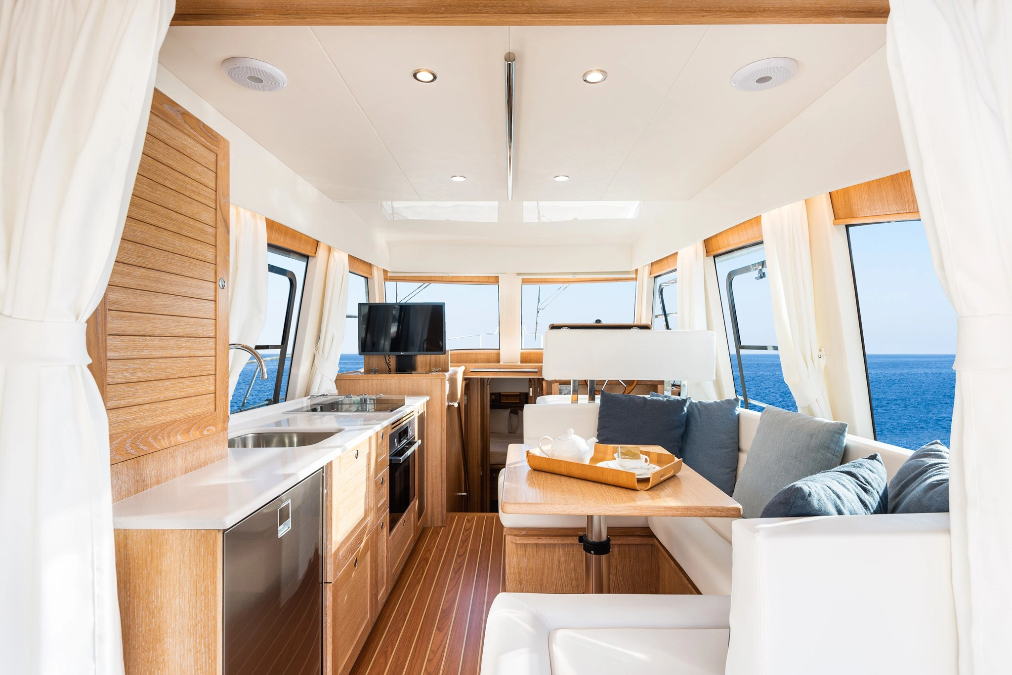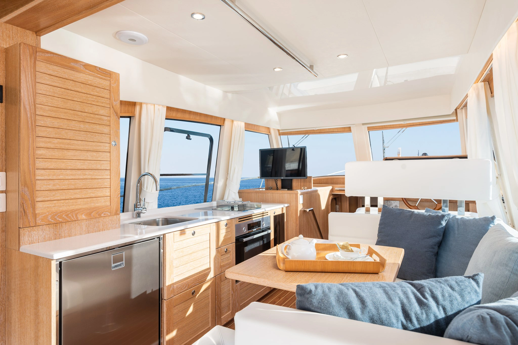 Los interiores, de estilo clásico y materiales cálidos, crean una atmósfera serena y equilibrada, pensada para disfrutar del barco con calma y sin artificios.