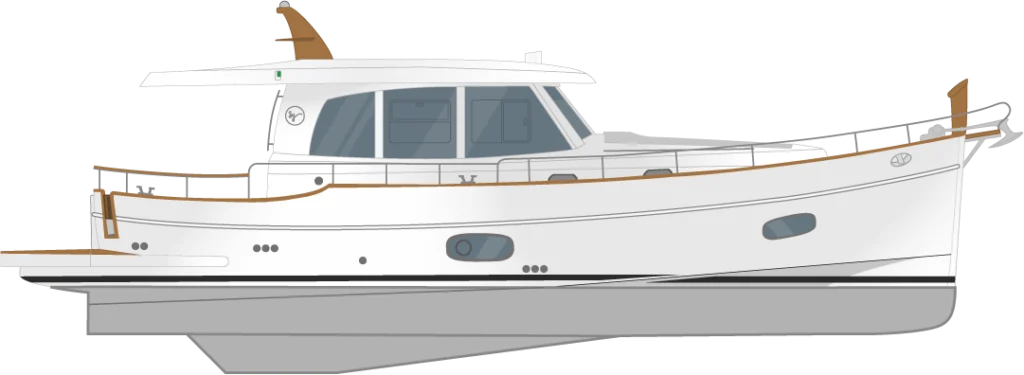 La circulación a bordo se resuelve mediante un amplio walkaround, que permite desplazarse con seguridad a lo largo de toda la cubierta. La regala de madera natural refuerza la estética clásica del conjunto y mejora el agarre durante las maniobras.