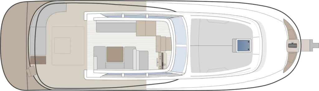 En la parte superior, el flybridge panorámico ofrece una zona elevada con vistas abiertas de 360°. Está protegido por barandillas perimetrales de seguridad y equipado con una dinette en U, mesa central de teca plegable y un amplio solárium, configurando un espacio versátil tanto para la navegación como para el descanso en fondeo.